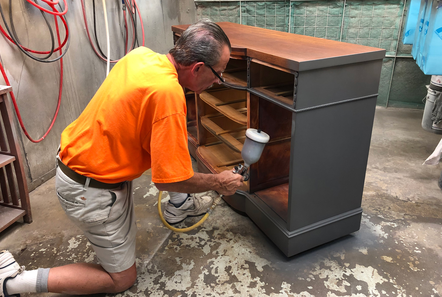 Our wood-shop features a professional paint booth that allows us to complete your paint project quickly. We can paint, stain or refinish any type of wood furniture. Paint is custom made in lacquer to match any sample you provide! You can also choose the sheen of your paint color.